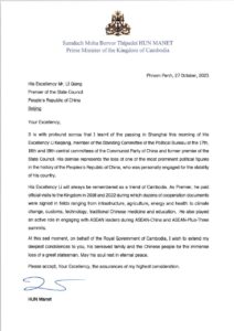 សម្តេចមហាបវរធិបតី​ ហ៊ុន​ ម៉ាណែត​ នាយករដ្ឋមន្ត្រី​នៃព្រះរាជាណាចក្រកម្ពុជា​ ផ្ញេីសារលិខិតរំលែកមរណ:ទុក្ខជូនឯកឧត្តម​ លី​ ឈាង​ នាយករដ្ឋមន្ត្រីនៃសាធារណរដ្ឋប្រជាមានិតចិន​ ចំពោះមរណភាពរបស់ឯកឧត្តម​ លី​ ខឺឈាង​ អតីតនាយករដ្ឋមន្ត្រីនៃសាធារណរដ្ឋប្រជាមានិតចិន។