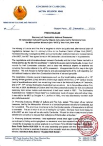 សម្តេចមហាបវរធិបតី ហ៊ុន ម៉ាណែត នាយករដ្ឋមន្ត្រី នៃព្រះរាជាណាចក្រកម្ពុជា បានស្វាគមន៍នូវរតនវត្ថុរបស់ព្រះរាជាណាចក្រកម្ពុជាមកកាន់មាតុភូមិវិញ។ ការនាំយកវត្ថុបុរាណខ្មែរ ចំនួន ១៤រូបនេះ គឺជាការនាំយកព្រលឹងដូនតារបស់ខ្មែរ ដែលបានឃ្លាតចាកចេញពីមាតុប្រទេសដោយសារភាពរ៊ាំរៃញាំញីដោយសង្គ្រាម មកពូនជ្រំនូវមរតកវប្បធម៌លើដែនដីសុវណ្ណភូមិឡើងវិញ អំឡុងពេលប្រទេសមានសន្តិភាពពេញលេញ។
