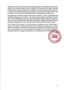 ក្នុងនាមជាប្រមុខរាជរដ្ឋាភិបាលកម្ពុជា ខ្ញុំសូមកោតសរសើរ និងវាយតម្លៃខ្ពស់ លើកិច្ចខិតខំប្រឹងប្រែងរបស់ថ្នាក់ដឹកនាំក្រសួងវប្បធម៌ និងវិចិត្រសិល្បៈ លើកិច្ចការដ៏សំខាន់នេះ ហើយក៏សូមអរគុណដល់សារមន្ទីរ Metropolitan Museum (MET) នៅទីក្រុងញូវយ៉ក ដែលយល់ព្រមប្រគល់មកវិញនូវវត្ថុបុរាណដែលជាកម្មសិទ្ធិរបស់កម្ពុជាមកឱ្យម្ចាស់ដើមក្នុងការថែរក្សា ការពារ នូវមរតកសិល្បៈ និងវប្បធម៌ដ៏មានតម្លៃ ឥតកាត់ថ្លៃបាន។